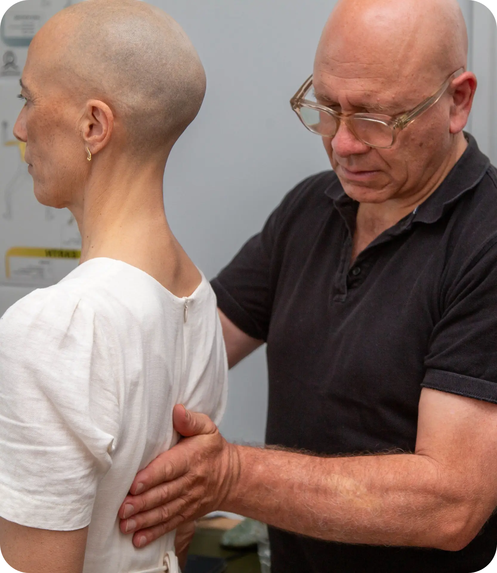 I look at the person’s body in relation to gravity by laying my hand lightly on the top of the person’s head sensing the greatest restriction within the connective tissue of the whole structure.(Including organs vascular and nerve function impairment)
